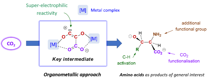 The group is using carbon dioxide as a C1 synthon for the formation of value-added products. Using an organometallic approach, we are transforming this inert and stable molecule into reactive intermediates, allowing further functionalization.